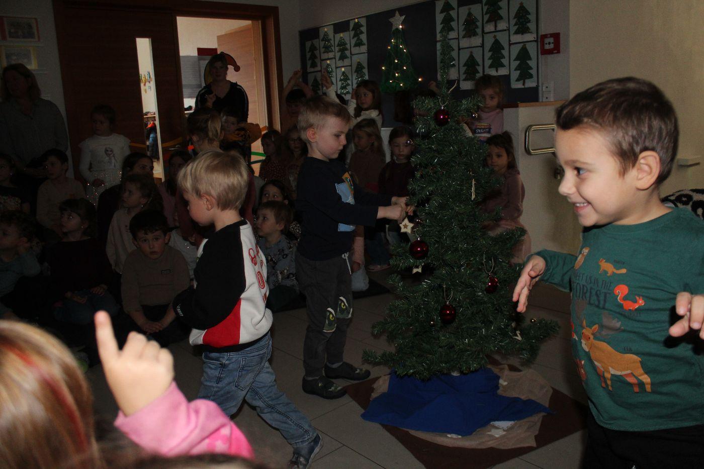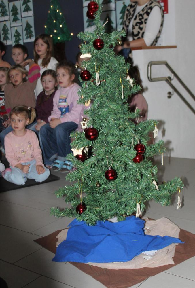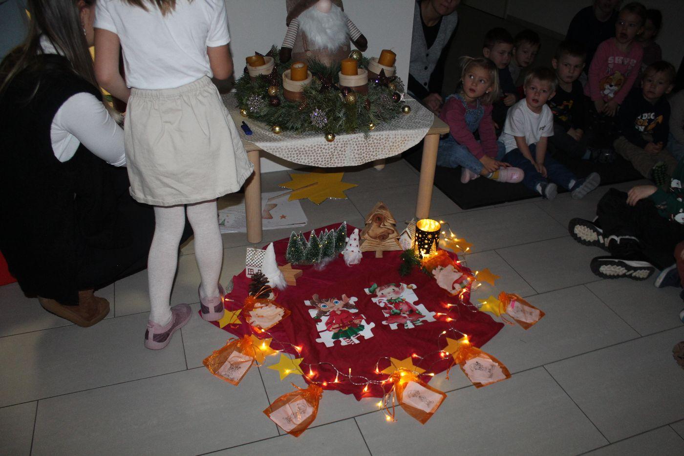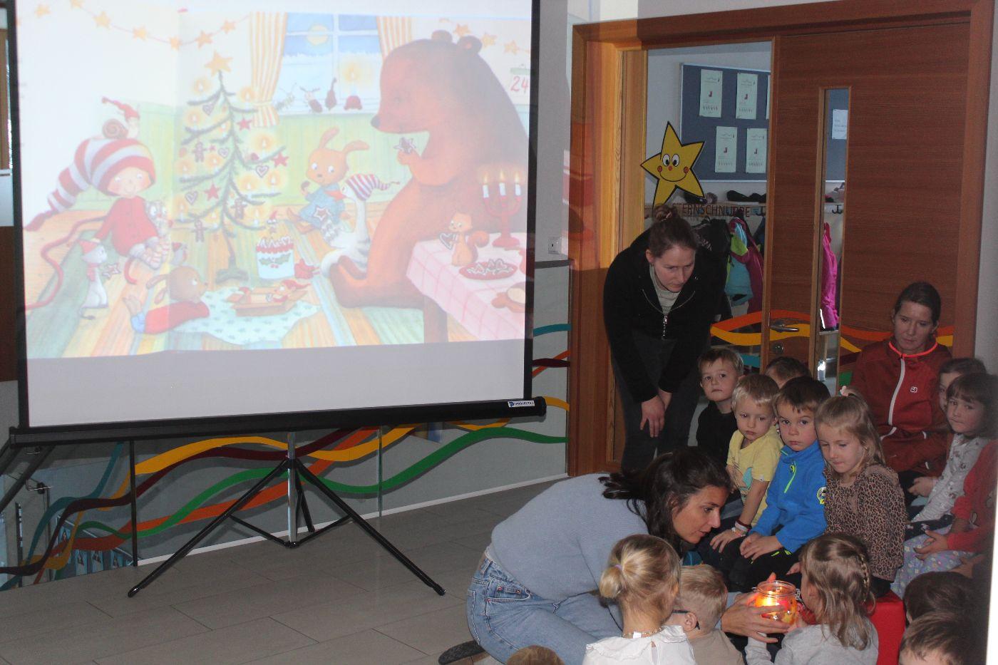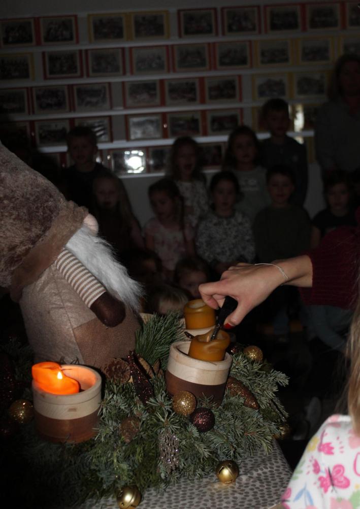 In der stimmungsvollen Adventzeit kommen jeden Freitag alle 5 Gruppen und die Purzlzwerge im Hausgang an unserem festlich geschmückten Adventskranz zusammen. In ruhiger und feiner Atmosphäre zünden wir gemeinsam die Kerzen an und nehmen uns Zeit für Gemeinschaft und Besinnlichkeit. Wir lauschten der Geschichte von dem Wichtel Alfred und dem Wirbel um das Weihnachtsfest. Wir erlebten besinnliche Momente miteinander. Wir hörten eine Wichtelbewegungsgeschichte, eine nette Klanggeschichte eines Sterns, der die Wichtel in der Wichtelwerkstatt besuchte. Wir sangen zusammen Weihnachtslieder und abschließend haben die Kinder noch gemeinsam einen Baum geschmückt. Ein anderes Mal durften wir bei einer Weihnachtsmassage mitmachen und uns selbst etwas Gutes tun. Voller Staunen entdeckten wir ein magisches Bild von einem Weihnachtsbaum, welches nur mit einer Taschenlampe sichtbar wurde.