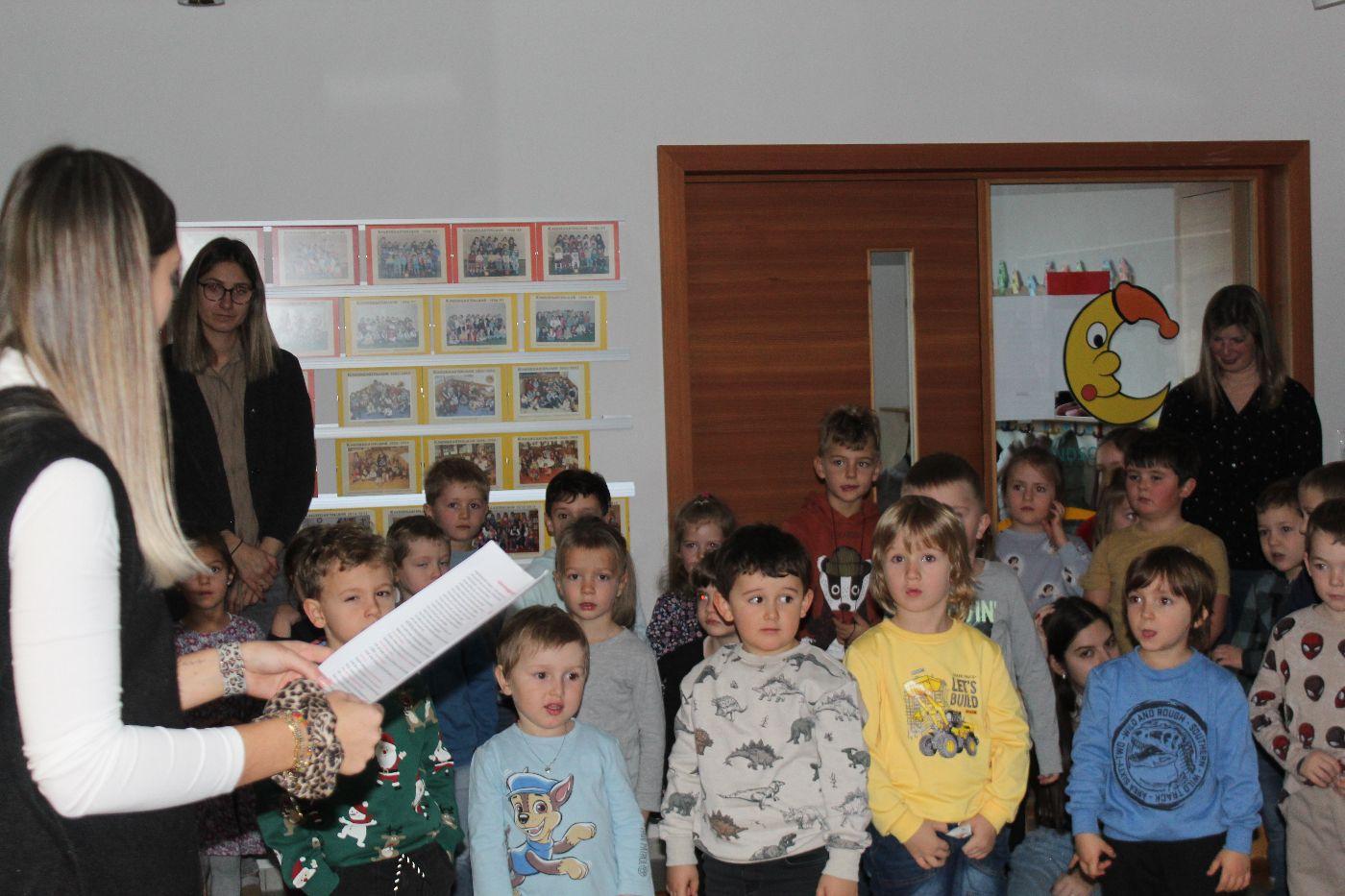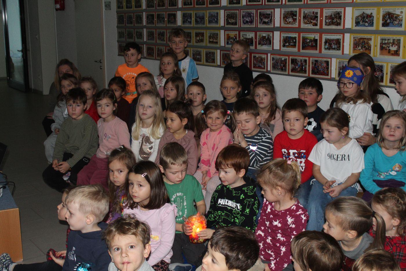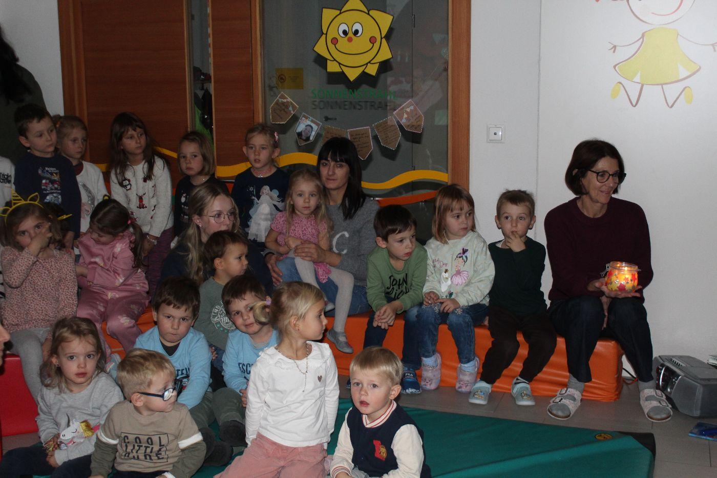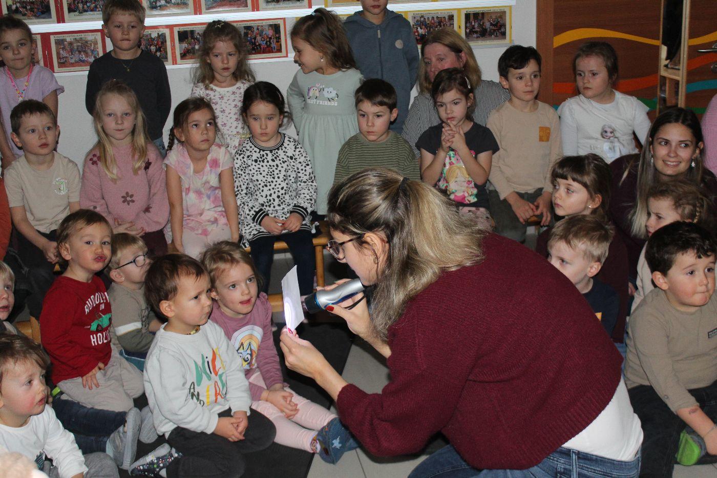 In der stimmungsvollen Adventzeit kommen jeden Freitag alle 5 Gruppen und die Purzlzwerge im Hausgang an unserem festlich geschmückten Adventskranz zusammen. In ruhiger und feiner Atmosphäre zünden wir gemeinsam die Kerzen an und nehmen uns Zeit für Gemeinschaft und Besinnlichkeit. Wir lauschten der Geschichte von dem Wichtel Alfred und dem Wirbel um das Weihnachtsfest. Wir erlebten besinnliche Momente miteinander. Wir hörten eine Wichtelbewegungsgeschichte, eine nette Klanggeschichte eines Sterns, der die Wichtel in der Wichtelwerkstatt besuchte. Wir sangen zusammen Weihnachtslieder und abschließend haben die Kinder noch gemeinsam einen Baum geschmückt. Ein anderes Mal durften wir bei einer Weihnachtsmassage mitmachen und uns selbst etwas Gutes tun. Voller Staunen entdeckten wir ein magisches Bild von einem Weihnachtsbaum, welches nur mit einer Taschenlampe sichtbar wurde.