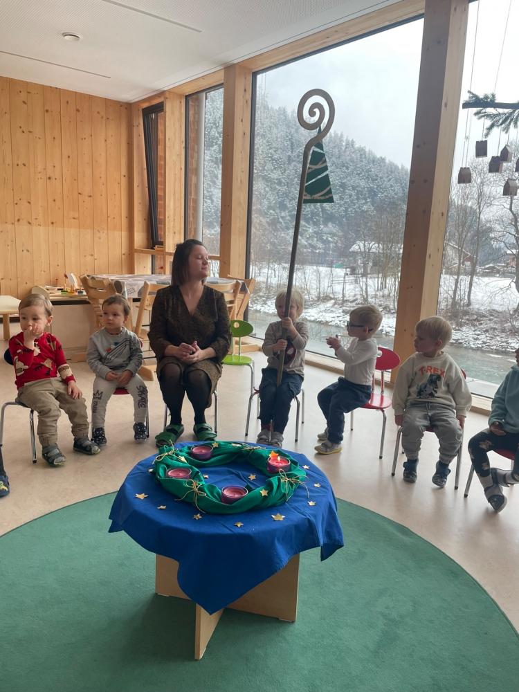 Andächtig lauschten die Kinder dem heiligen Mann, als er aus dem goldenen Buch vorlas, sangen ihm ihr Nikolauslied vor und erhielten ihren selbst gewerkten Nikolausbehälter gefüllt mit süßen Überraschungen zurück. Anschließend ließen wir den aufregenden Vormittag bei der gemeinsamen Jause ausklingen.