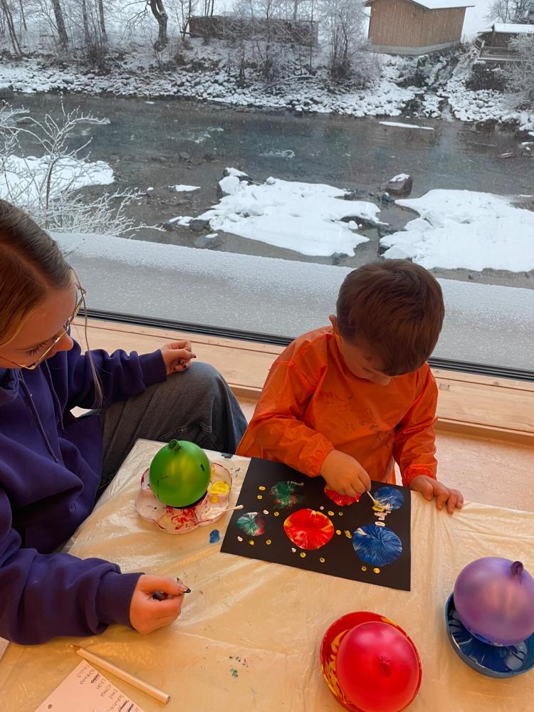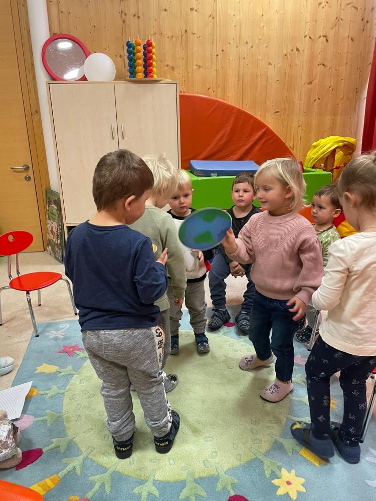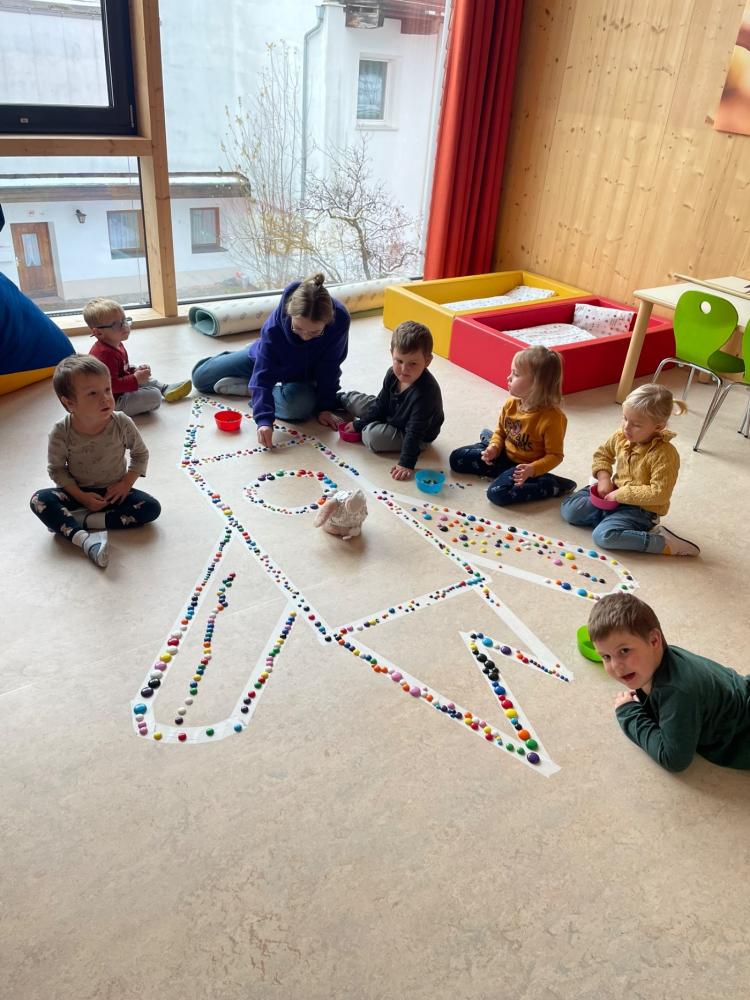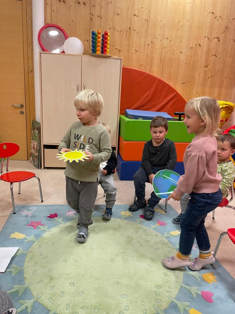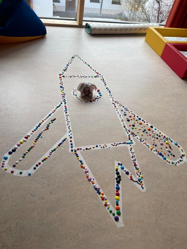 Wir entdecken die Planeten, betrachten ein Bilderbuch, gestalten Legearbeiten und erleben eine Turnstunde im "Weltraum". Die Kinder schütten echtes "Mondgestein", malen strahlende Planeten mit der Luftballontechnik und steigen zum Abschluss in unsere selbst gebaute Raketen ein - bereit für das Abenteuer im Kosmos!