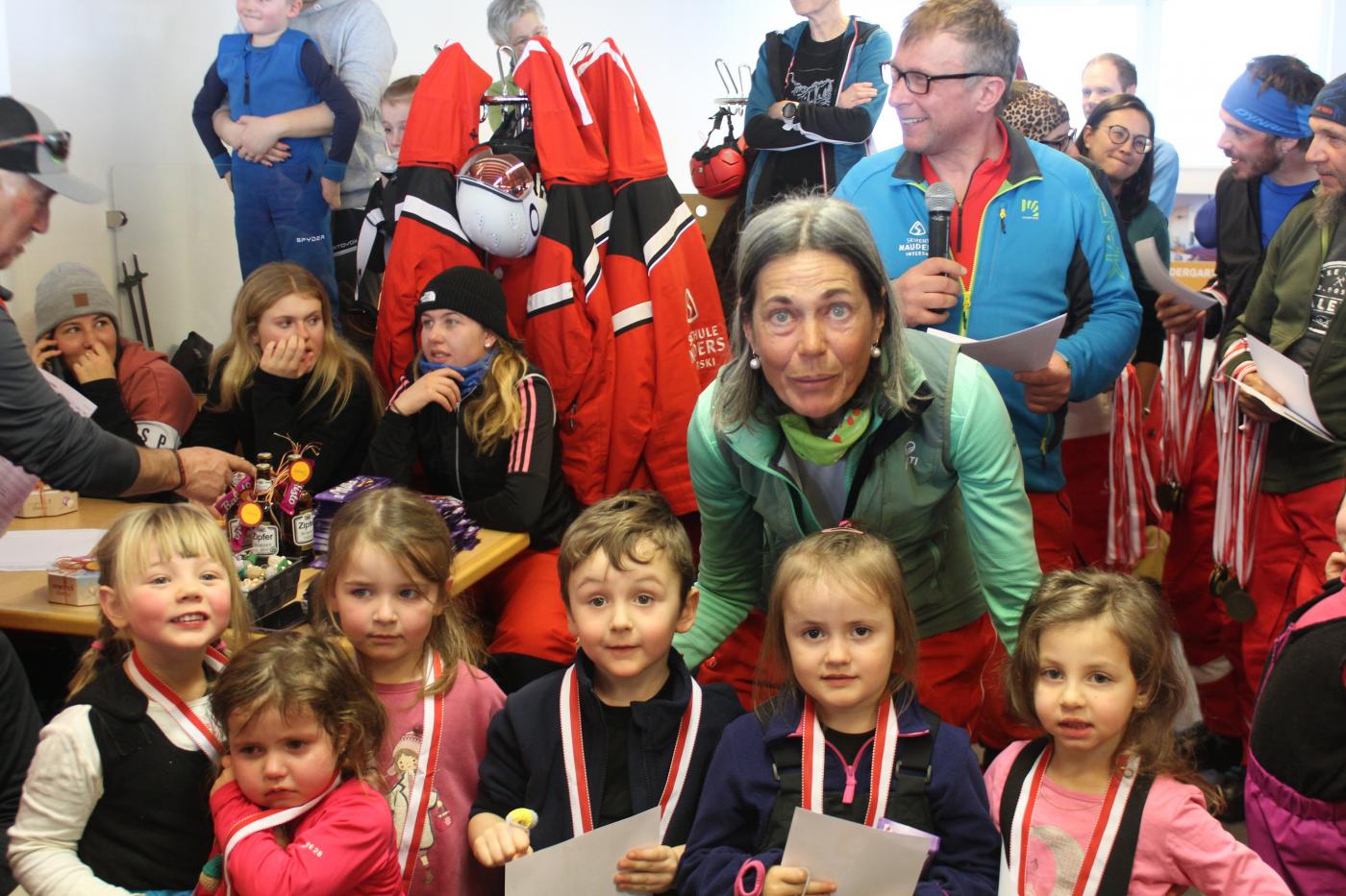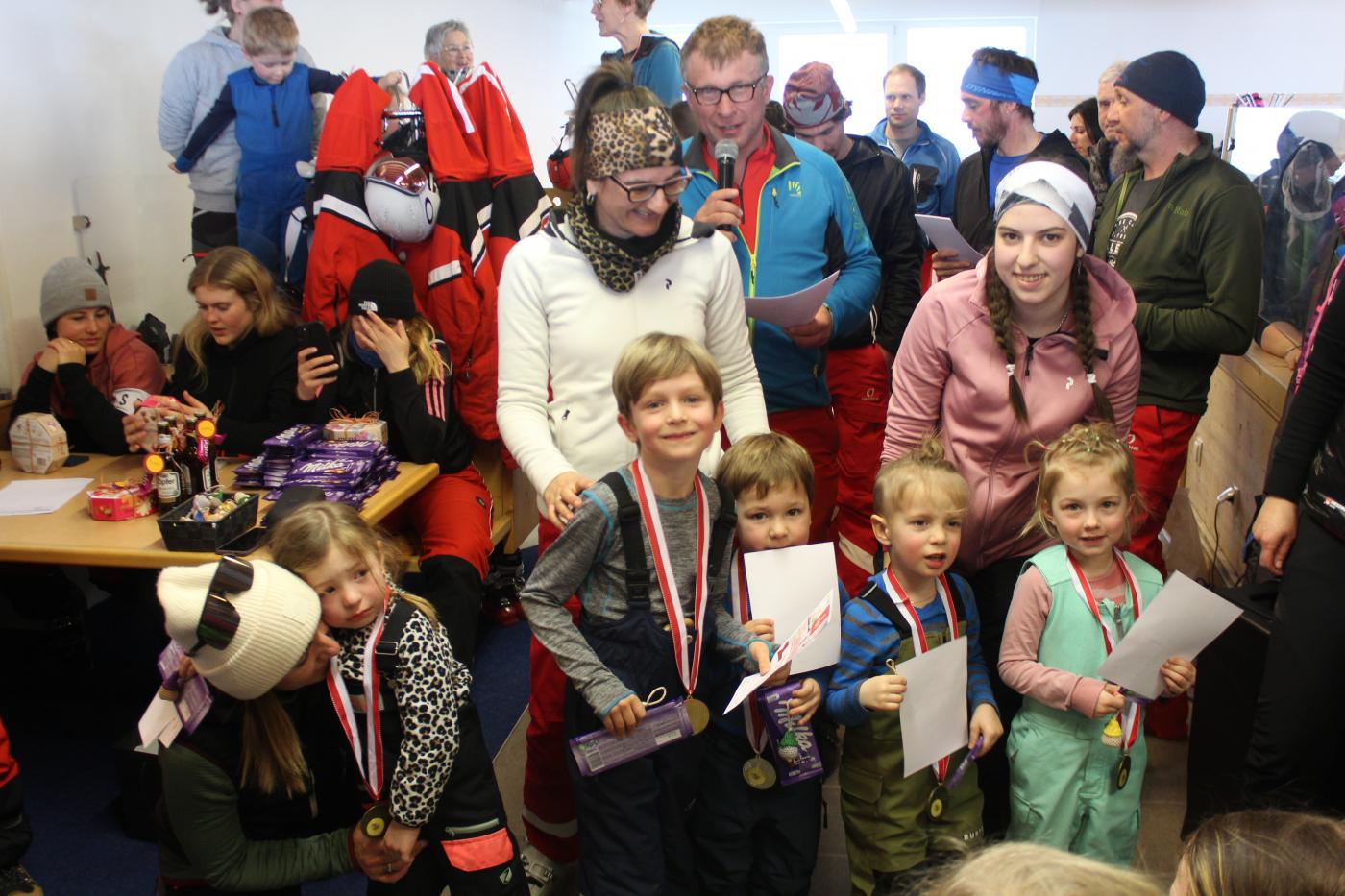 Ein guter Rennfahrer braucht unter anderem auch eine gute Verpflegung, für die, die Frauen im Kinderrestaurant optimal gesorgt haben. Nach dieser erlebnisreichen Woche konnten nun alle Kinder ihr Können beim Abschluss-Skirennen unter Beweis stellen. Zum Abschluss des Kurses gibt es eine kleine Preisverteilung, bei der jedes Kind für seine tollen Fortschritte geehrt wird. Dies zeigte sich dann im Anschluss bei der Preisverleihung, bei der die Kinder mit einer Medaille, einer Urkunde und Schokolade ausgezeichnet wurden. Besonders die selbstgemachten Wichtelchen von Gerti haben den Kindern eine große Freude bereitet. Dafür vielen Dank.
